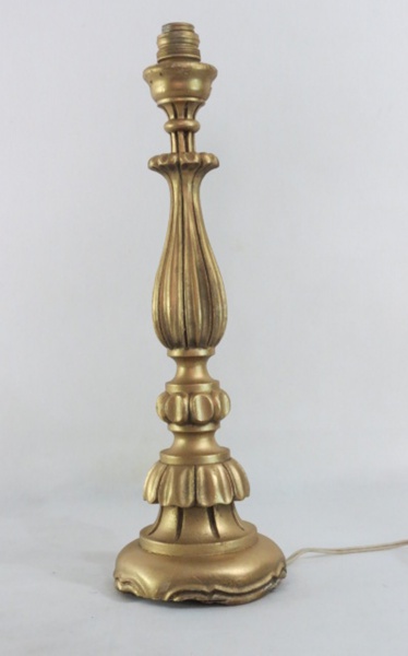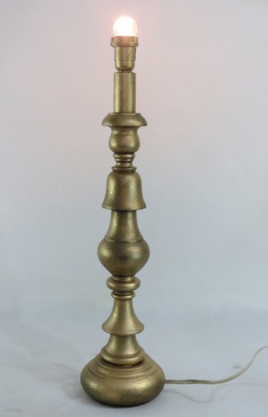 • Tocheiro em madeira nobre, base redonda, coluna torneada, patinado em dourado. Med. 56 cm alt.