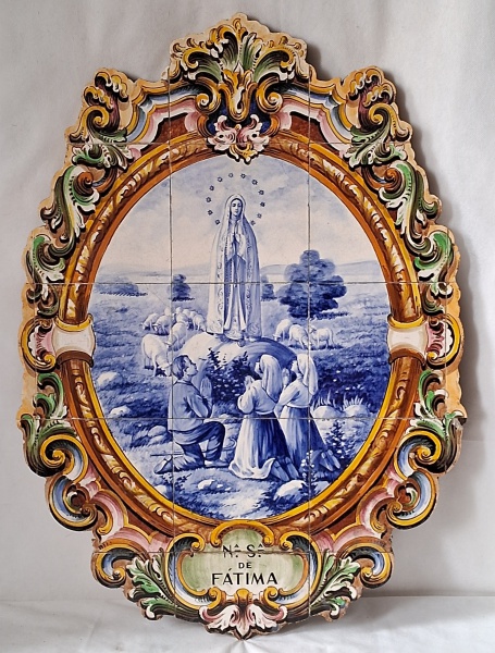 • Antigo e raro Painel de azulejos da prestigiosa fábrica portuguesa de azulejos Aleluia Aveiro, na representação de Nossa Senhora de Fátima, em policromia azul e branco com borda em arabescos e flores. Assinado no canto superior direito Aleluia Aveiro. Portugal, início do século XX. Medidas: 61 x 61 cm. Obs" Painel com parte da madeira com perdas de insetos tratadas e um mínimo restauro.