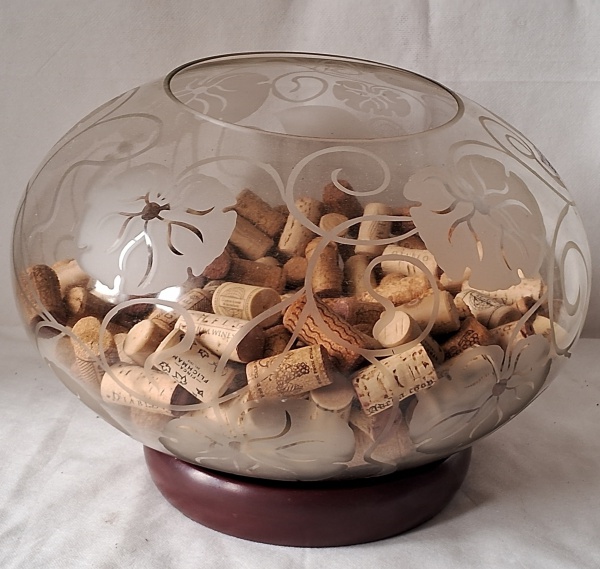 • Grande cachepot em Vidro, bojo decoração floral em acidado, com diversas rolhas . Acompanha base redonda em madeira. Med. 26 cm alt  x 35 cm diâmetro- peanha 4 cm alt x 20 cm diâmetro. PELA FRAGILIDADE NÃO É ACONSELHÁVEL ENVIAR PELOS CORREIOS.