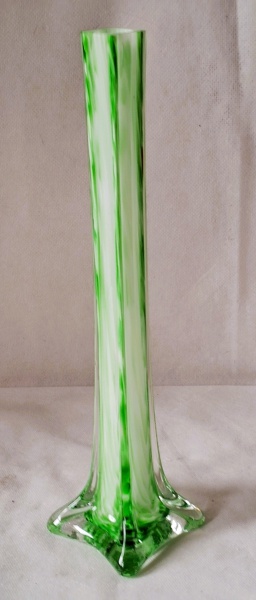 • Grande vaso solifleur em vidro artístico de Murano na cor verde em degradee, anos 70, base quadrangular pinçada. Med. 30 cm alt.