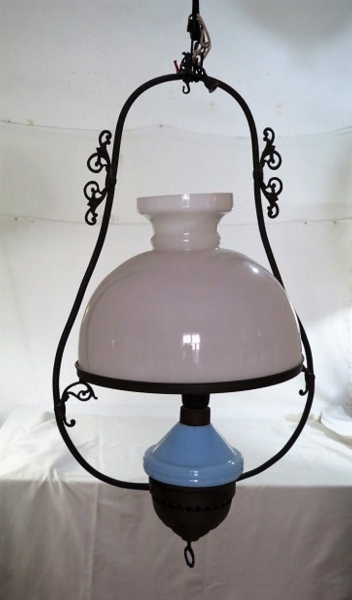 • Antigo Lampião de teto tipo lira adaptado para energia elétrica estilo Luiz XV com estrutura em metal ricamente cinzelado com trabalhos e, vazado, cúpula e base em opalina.Med: 57 cm altura x 34 cm diam. Não pode ser enviado pelos Correios pela sua fragilidade.