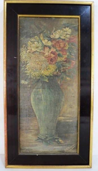 • O.A. TEIXEIRA  1921 Natureza Morta, óleo sobre Eucatex, assinado e datado no C.I.D, emoldurado. Med. 60 x 32 cm/50 x 22 cm.