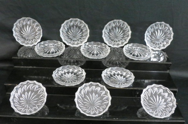 • Doze (12) porta copos em cristal translúcido, lapidação floral. Med. 9 cm diâmetro.