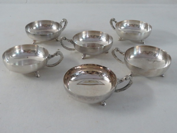 • Conjunto com seis (06) taças para sobremesa em metal espessurado a prata, base tripóide com alça lateral.