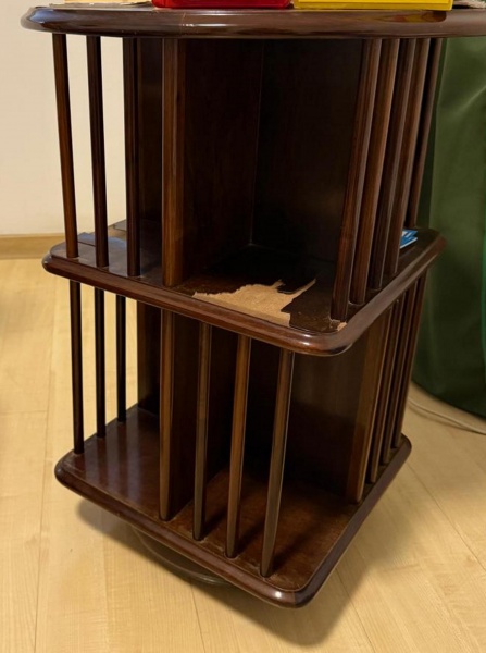• Antiga estante giratória em madeira nobre ripada com dois estágios. Obs: Falha na placagem. RETIRADA COM AGENDAMENTO EM COPACABANA. Med. 67 cm alt