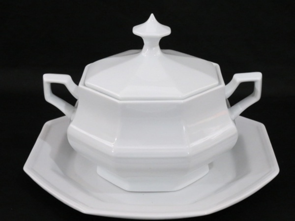 • Sopeira com presentoir em porcelana branca no formato octagonal, alças laterais e pega da tampa no formato de pinha. Acompanha presentoir  Med: sopeira  19 x 26 cm diâmetro- presentoir 32 cm diâmetro.