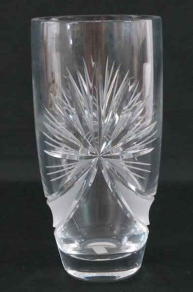 • Vaso em bloco de cristal translúcido, lapidado com frisos, acidado com desenhos em motivos florais. Med. 21 x 10,5 cm diâmetro.