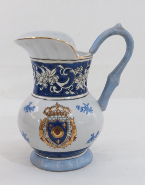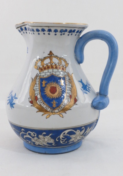 • Cia das Indias- Chateau de Versailles- Jarro em porcelana chinesa séc. XlX. Reserva central com Armas do Chatêau de Versailles., base com faixa floral em relevo. Complementos pictóricos florais em esmalte azul e outros adereços. Med. 24 cm x 19 cm diâmetro.