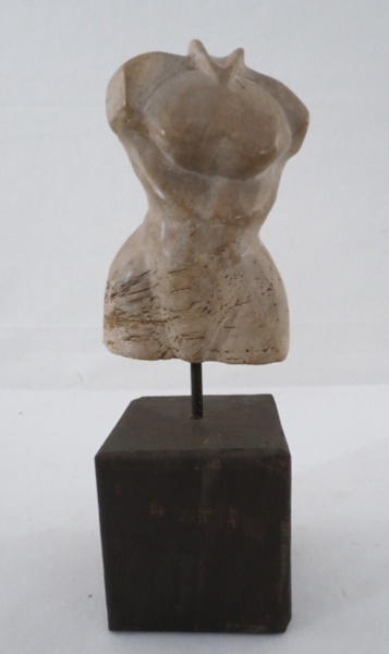 • Escultura em pedra representando " Torso Feminino", base cúbica em madeira. Med. 31 x 10 x 10 cm.