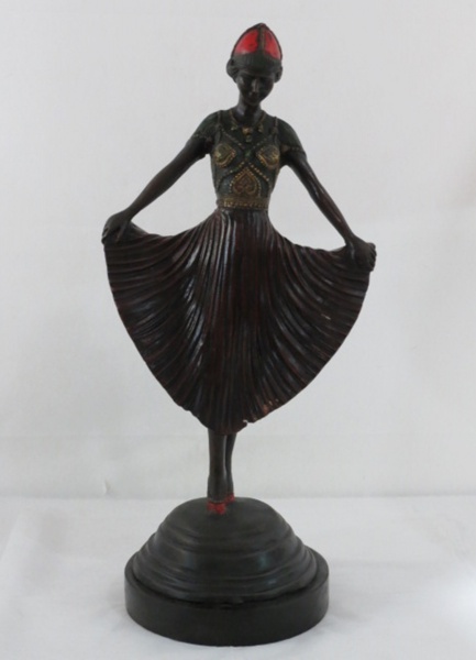 • ART DECO- Escultura representando " Bailarina" em resina patinada na cor de bronze, cabeça e mão na cor marfim. Base em mármore rajado. Falta uma mão. Med. 37 cm altura.