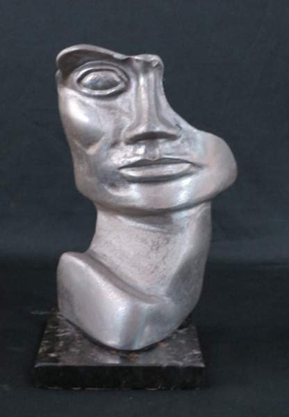 • Escultura em aluminio escovado, representando "Rosto masculino" sobre base de granito negro. Elaborada por artista plástico renomado da década de 50 em Londres. Med. 25 x 16 x 12 cm.