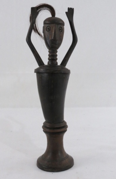 • ARTE TRIBAL AFRICANA, escultura africana, base em madeira, corpo em chifre, cabeça entalhada com cabelo de animal. As bonecas Akuaba são figuras da Etnia Ashamanti de Gana, são bonecas da fertilidade. Med. 25 cm alt.