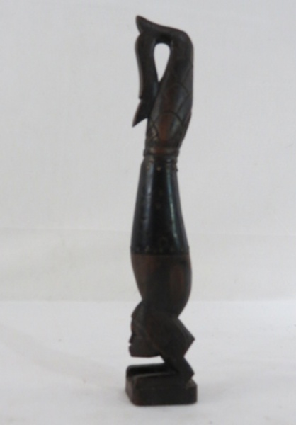 • ARTE TRIBAL AFRICANA, escultura africana em ébano, base entalhada com busto feminino, coluna com figura de boneca da fertilidade Etnia Akuaba, encimada com entalhes no formato de peixe. Med. 27 cm alt.