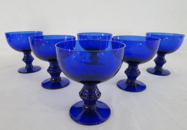 • Antigo conjunto com seis taças  para champanhe em demi cristal na cor azul royal ,da década de 60 . Med. 10 cm alt x 9 cm diâmetro.