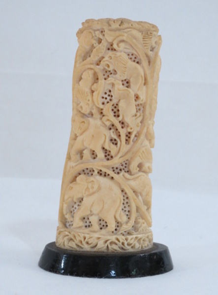 • MARFIM- Escultura de coluna com figuras de animais africanos variados em marfim, base de madeira. Med. 12 cm altura