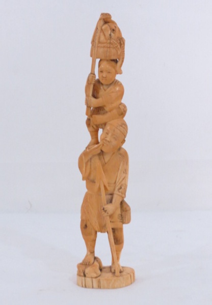 • MARFIM- Escultura de coluna com figuras de pescadores em marfim, base de madeira. Assinado na base com caracteres. Época Meiji (1868-1912). Med. 29 cm altura