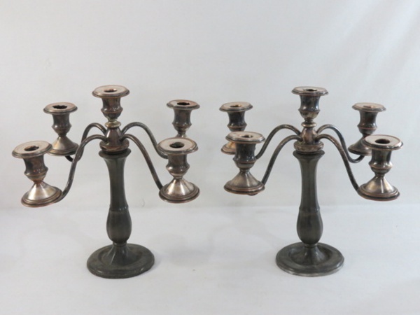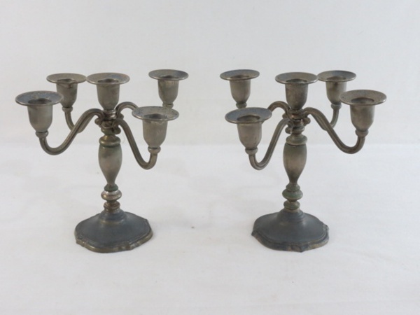 • Par de candelabros em metal espessurado a prata para cinco velas, base redonda, coluna alongada e facetada, podendo usr como castiçal, encimado por quatro braços curvos terminados em bobeche. Med. 33 cm alt. Desgaste no prateado, VENDIDO NO ESTADO.