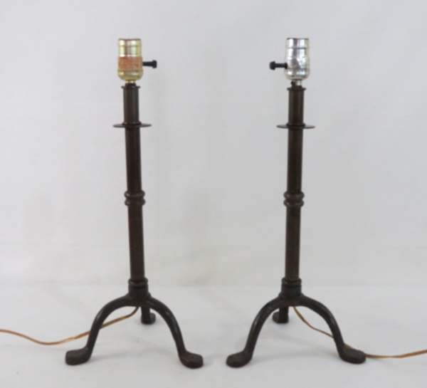 • Par de tocheiros adaptado para luminária de ferro, haste alongada.. Base tripóide, funcionando. Med. 45 cm alt.