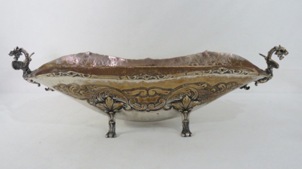 • Espetacular e antiga Floreira / centro de mesa, Art Noveau, em metal espessurado a prata com rico trabalho de fundição e cinzelado. Apresenta quatro pés e alças no formato de dragão alado, galeria vazada ornada com guirlandas florais em relevo. Recipiente interno em metal espessurado a prata.  Prateação no estado. Med. 20 cm x 66 x 18 cm.