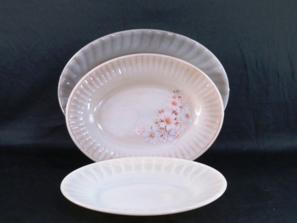 • COLOREX- Três (03) travessas ovais em três tamanhos e modelos diversos. Med. maior 36 x 26 cm, média 31 x 24 cm, pequena 27 x 21 cm.