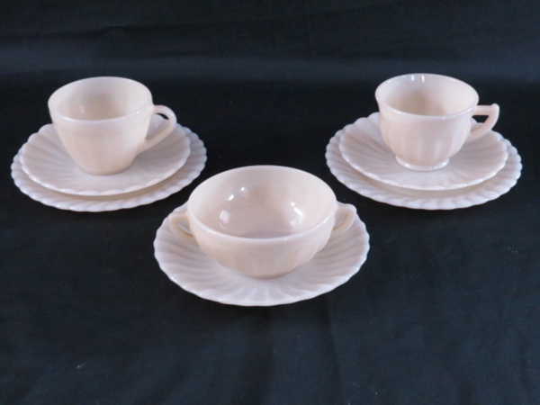 • COLOREX - Dois trios para chá e uma consommé em vidro leitoso, bojo canelado. Marcado no fundo. Med. consomé 5,5 x 11 cm diâmetro.