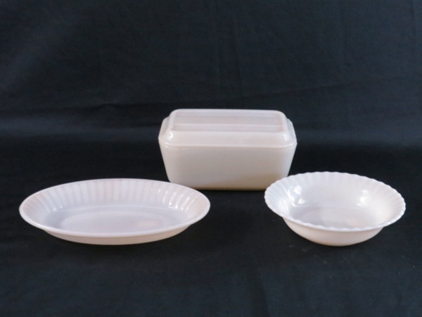 • COLOREX- Três (03) peças sendo; travessa oval , tigelinha e uma mantegueira retangular. Meds. travessa 21 x 15 cm, tigelinha 4 x 15,5 cm, mantegueira 9 x 17 x 11 cm. Obs: Mantegueira com mínimos bicados na tampa.