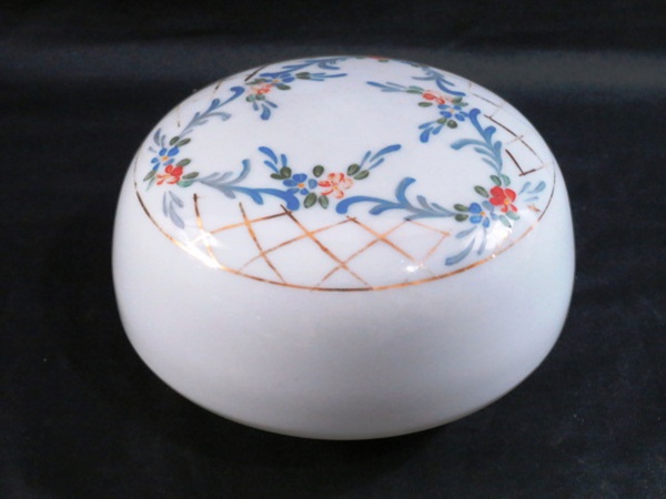 • Antiga cúpula esférica em opalina leitosa, estilo Art Deco adornado com delicada pintura de flores e guirlandas, pintadas a mão. Med: 15 cm circunferência e bocal com 10 cm diâmetro.