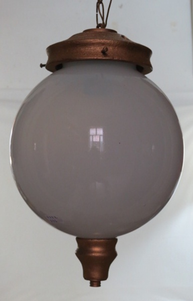 • Lustre redondo em opalina leitosa, para uma luz, com adereços em madeira no tom dourado. armação sustentada por correntes. Med. 28 x 18 cm diâmetro.