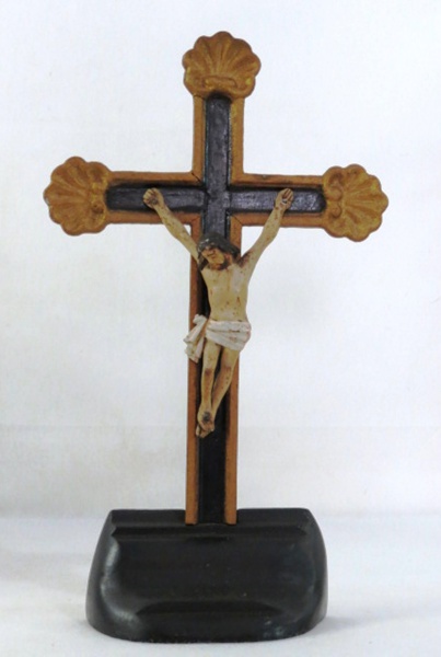• ARTE SACRA- Belíssima imagem de Jesus Cristo crucificado em madeira policromada, Brasil século XX , base em pedestal. Med. 36 cm alt.