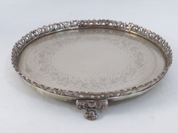 • Salva em metal espessurado a prata , três pés em garra,  borda vazada com volutas, fundo cinzelado com folhagens. Med. 23 cm diâmetro.