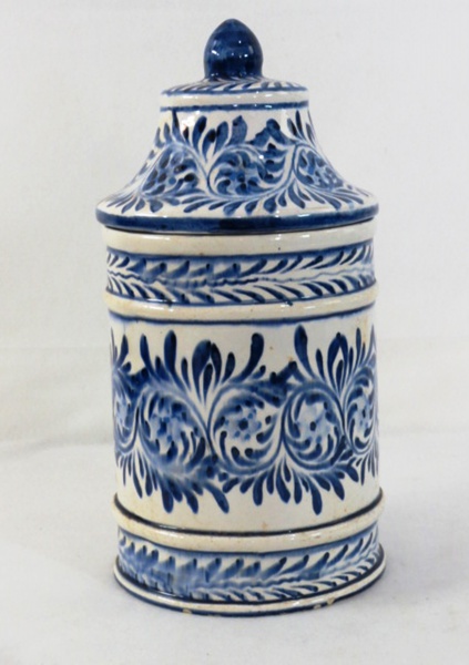 • Um grande e imponente pote em cerâmica vitrificada branca, ricamente decorado em tom azul com flores e folhagens. Med. 34 cm alt x 17 cm diâmetro.  Mínimo desgastes na base ( bicadinho). Marcado na base.