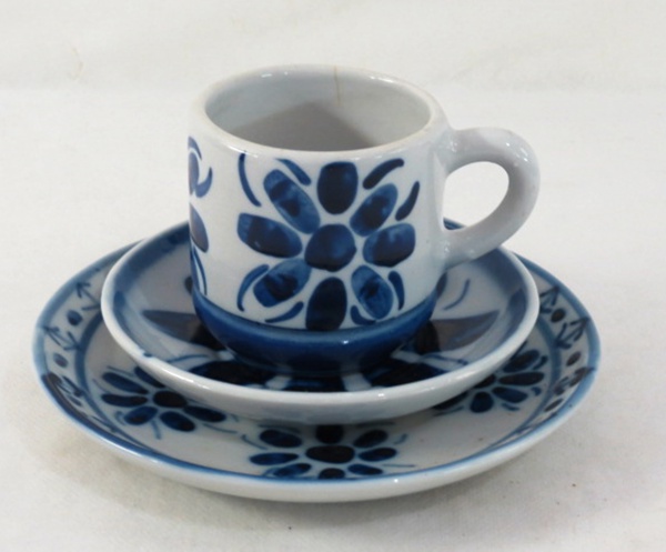 • PORCELANA MONTE SIÃO MG -Trio Para Chá e Bolo, em porcelana vitrificada branca nacional decorado com flores e geométricos pintados à mão na tonalidade azul, marcado no fundo. Med. 8 cm alt x 8 cm diâmetro.