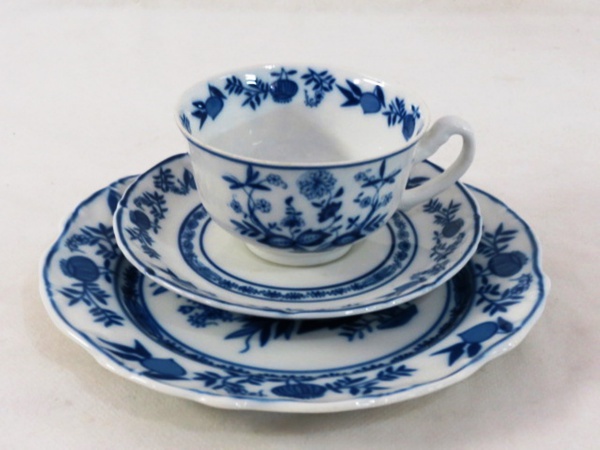 • STEATITA - PADRÃO CEBOLINHA - CONHECIDO COMO O BORRÃO BRASILEIRO - Belíssimo Trio Para Chá e Bolo, em porcelana branca com decoração na tonalidade "Blue & White", no padrão dito "cebolinha", borda movimentada, com faixa azul, com marca da manufatura na base. Composto de uma Chávena com Pires e Prato de Bolo. Med. 5,5 cm X 9,5 cm e 19,5 cm (Alt./Diâm.