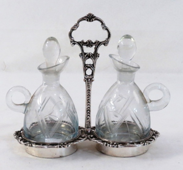 • Elegante galheteiro em metal espessurado à prata, galhetas em demi cristal lapidado com folhagens. Med. 18 x 19 x 9 cm.