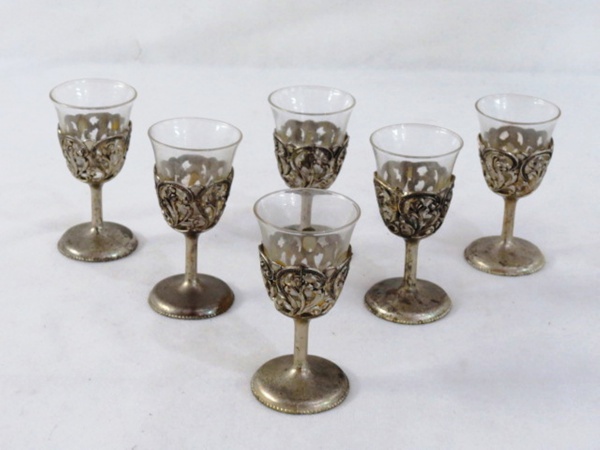 • JAPAN- Seis (06) cálices em vidro com estrutura em metal prateado com decoração em guirlandas. Marcado. Med. 10 cm alt.