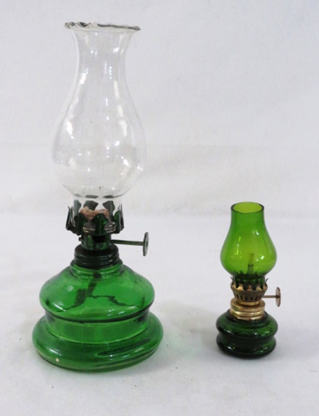 • Dois (02) antigos lampiões em vidro verde, manga translúcida com babados. Meds maior 21 cm alt, menor 10 cm alt.