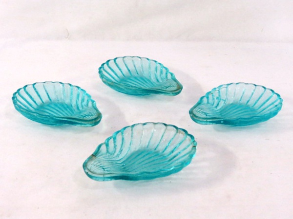 • Quatro (4) antigas petisqueiras em vidro prensado,moldadas na forma de concha na cor azul , anos 50/60. Med.: 13 X 9 cm.