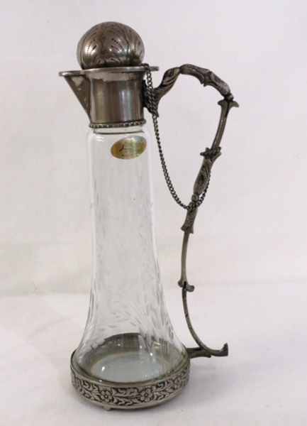 • Antiga jarra decanter para vinho, bojo em cristal lapidado com trigos. Borda e base em metal espessurado a prata cinzelado. Med. 38 cm altura. Com selo.