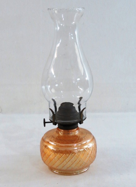 • Antigo lampião a querosene, base em vidro " Carnival Glass", manga em vidro translúcido, borda ondulada. Med. 29 x 10 cm.
