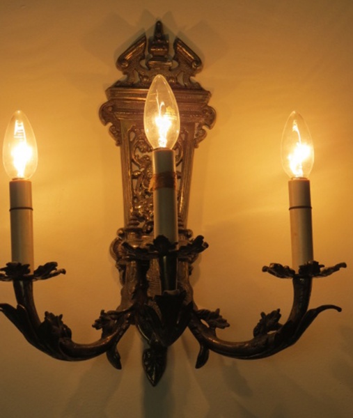 • Arandela com guarnição em bronze cinzelado para três lâmpadas, toda decorada com folhagens e guirlandas. Med. 40 x 38 x 23 cm.